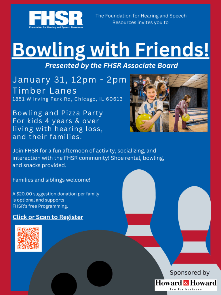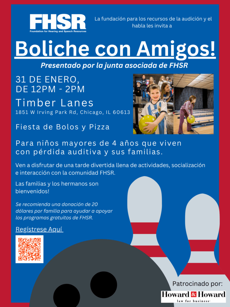 ¡Disfrute de un buen rato en nuestra fiesta anual de boliche para niños con sordera y discapacidad auditiva y sus familias! El alquiler de zapatos, el boliche y los bocadillos corren por nuestra cuenta, para que los niños y sus hermanos puedan disfrutar de una tarde de diversión y amistad. ¡No se pierda este evento favorito de las familias de FHSR!
