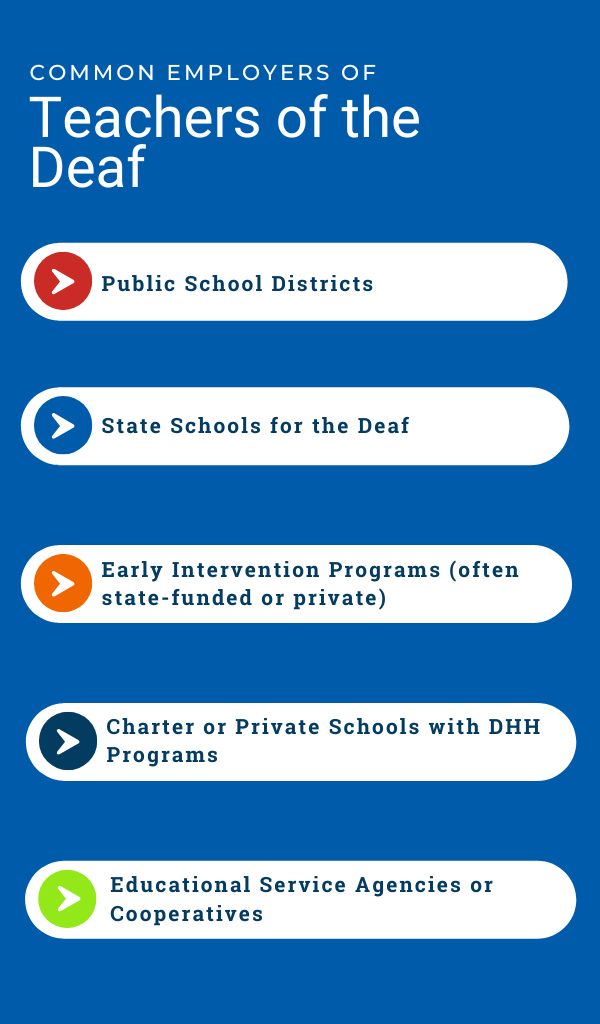 As a teacher of the deaf, there are a variety of job opportunities in different educational and support settings. These roles focus on teaching, supporting communication development, and helping deaf or hard of hearing students reach their academic and social potential. Here are some common job options: